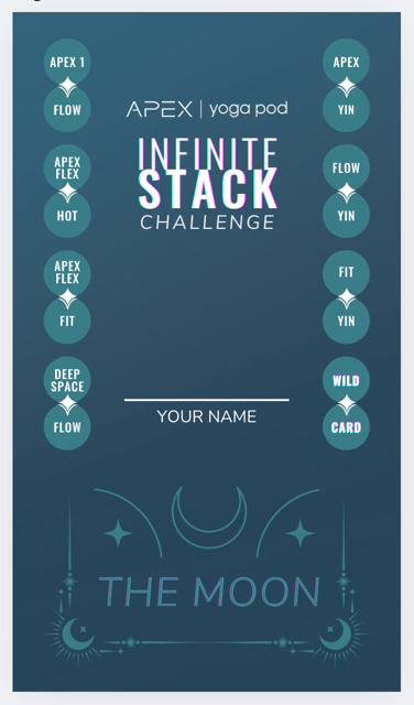 Infinte Stack ChallengeOct 13- Nov 16 16 Classes in 8 Stacks.2 Cards in 1 Challenge. Challenge Cards: Choose your journey Schedule Stacks: Set Your Intention, Set Your Schedule View the full stack schedule How to play: